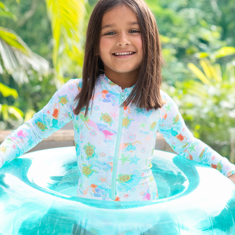 Protect them from the sun with all-over coverage rash tops & swimwear.