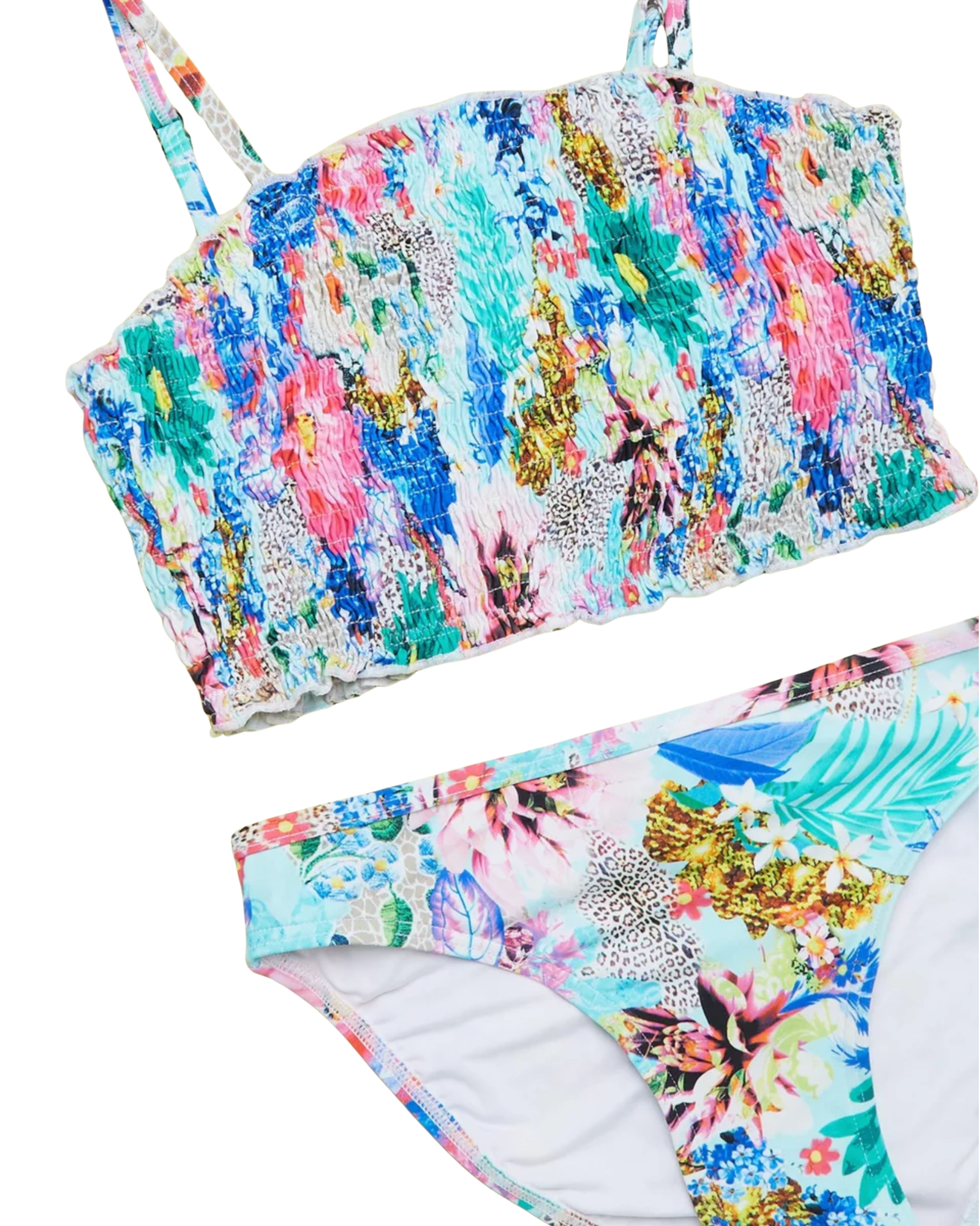 Tropical floral and animal print bikini with ruched top with adjustable shoulder straps with pant a classic fit pant.